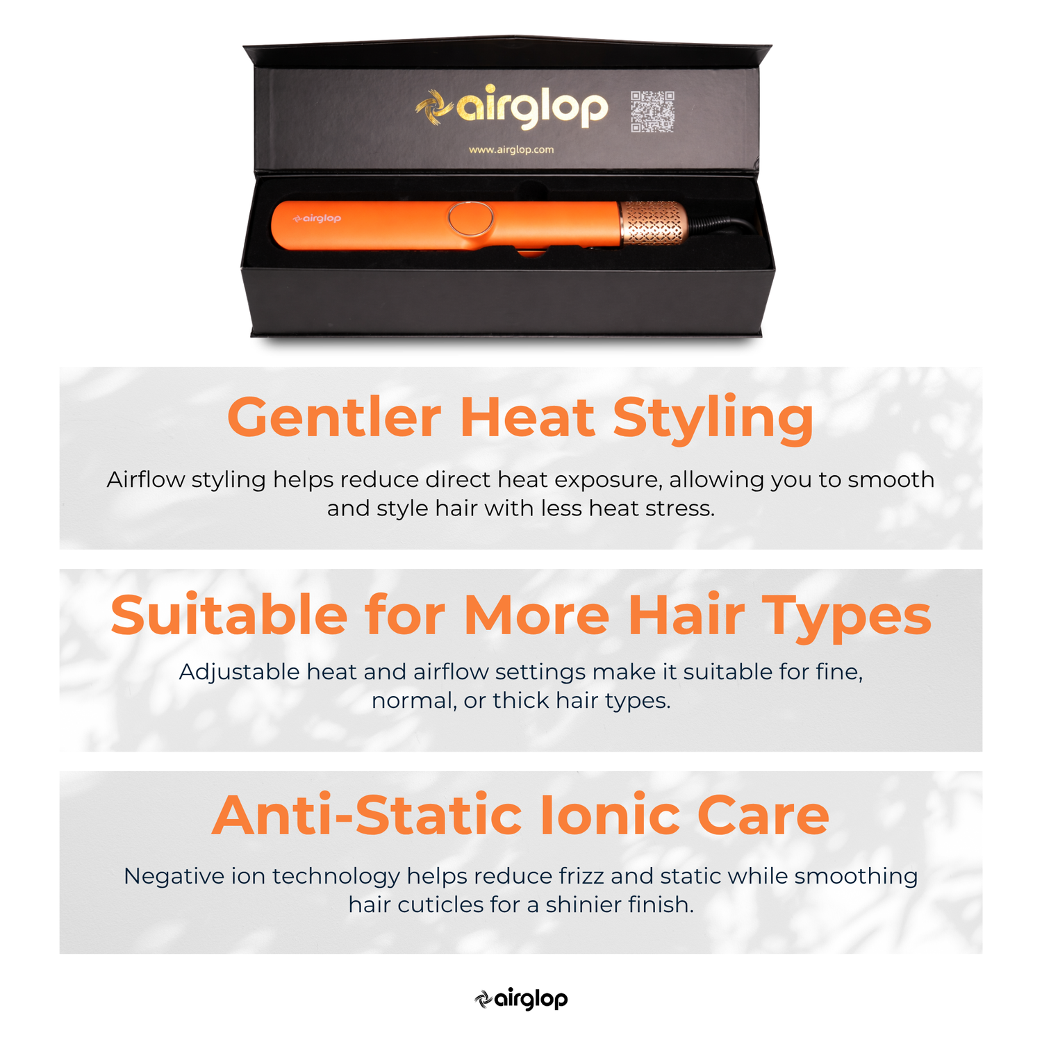 Airglop Air Glider hava düzləndiricisi xətti hava axını ilə saçınızı eyni anda qurudub düzləndirir, hər keçiddə təbii parlaq düz saç üçün vaxta qənaət edir. İstifadə zamanı havanın çıxış zonası qızına bilər — toxunmazdan əvvəl soyumasını gözləyin.